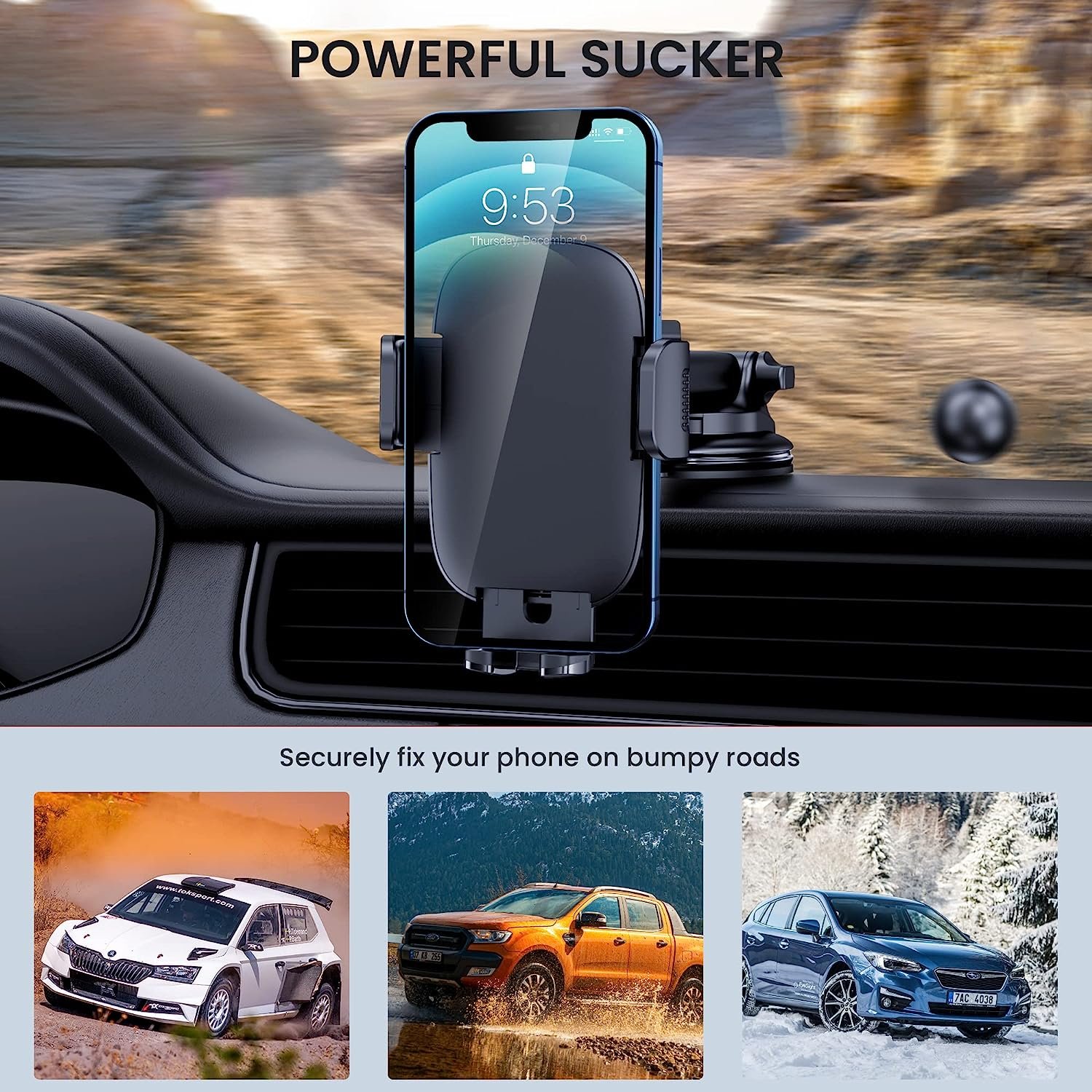 • Enhanced Suction Cup: Phone holder mount is equipped with double-lock suction cup and uses heat-resistant TPU material , which can provide strong suction power on smooth surfaces, and keep the mount stable in any conditions. To restore adhesion, simply rinse the sticky surface with warm water and wipe dry.