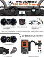• Accurate Fast and Easy to Use: The AD310 scanner can help you or your mechanic understand if your car is in good condition, provides exceptionally accurate and fast results, reads and clears engine trouble codes in seconds. If you want to find out the cause of the check engine light, this device will let you know immediately and fix the problem right away without any car knowledge. No need for batteries or a charger, get power directly from the OBDII Data Link Connector in your vehicle.