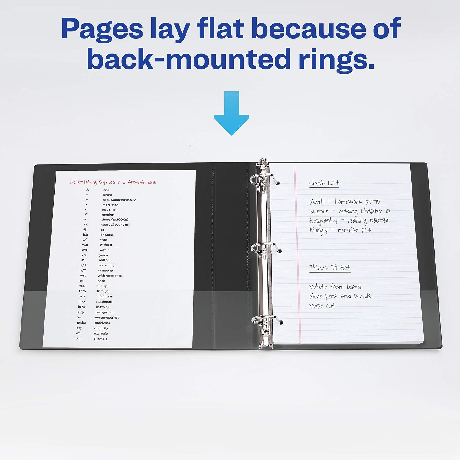 • Important documents and presentation materials stay flat like they’re supposed to because slant rings are mounted on the rear binder panel instead of on the spine