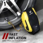 • [FAST INFLATING & EASY OPERATION] This auto tire air compressor can inflate your standard car tires in seconds. Plug it into the 12V power outlet in your car and attach the stem to the tire valve. A simple press on the car air compressor and it will do all the work for you. A great solution for emergency on the way.